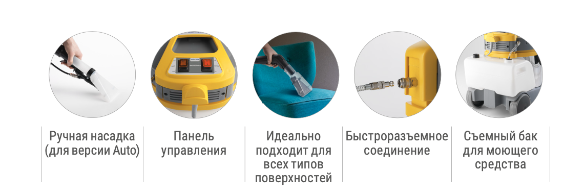 - Давление помпы 4 бар обеспечивает эффективное распыление моющего раствора